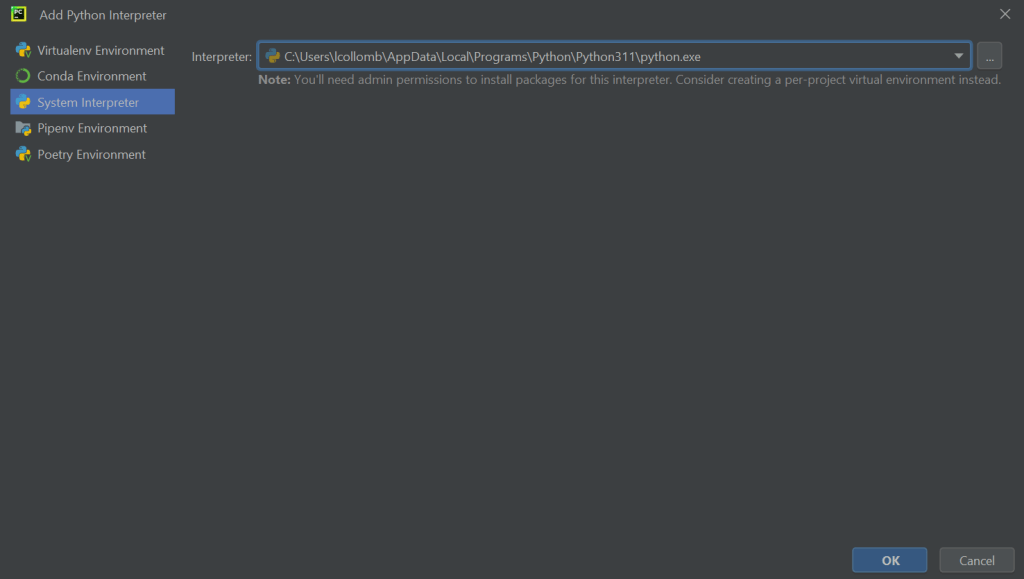 11. Click “⌂ Add Local Interpreter…“, then go to the “System Interpreter” tab and select your desired interpreter.