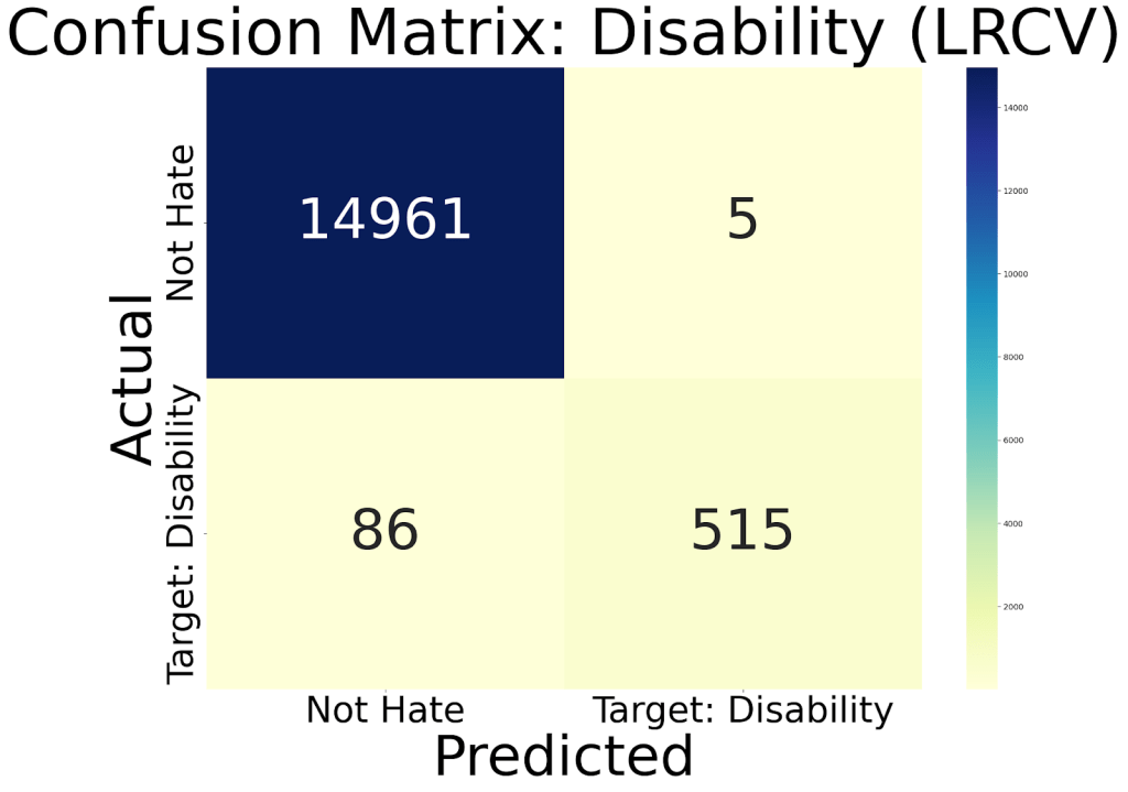 Even with those metrics, LRCV still performed quite well, handling the imbalance effectively and yielding strong results in terms of recall and F1 scores. This suggests that LRCV is a robust choice for classifying hate speech by targeted identifiers, although further fine-tuning and data balancing techniques could enhance performance even more.